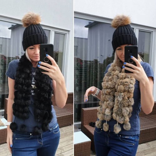 Jänesepallidest sall. Väga pehme ja soe. Pikkus: 120-130cm Laius: ~14cmVärvus: mustTellimisega palju muid värve. Tarneaeg muudele värvidele ca 3-4 nädalat.